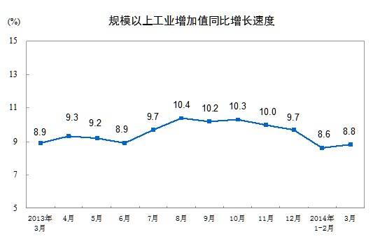 2014年3月份,規(guī)模以上工業(yè)增加值同比實(shí)際增長(zhǎng)8.8%(以下增加值增速均為扣除價(jià)格因素的實(shí)際增長(zhǎng)率),比1-2月份加快0.2個(gè)百分點(diǎn)。從環(huán)比看,3月份比上月增長(zhǎng)0.81%。一季度,規(guī)模以上工業(yè)增加值同比增長(zhǎng)8.7%。