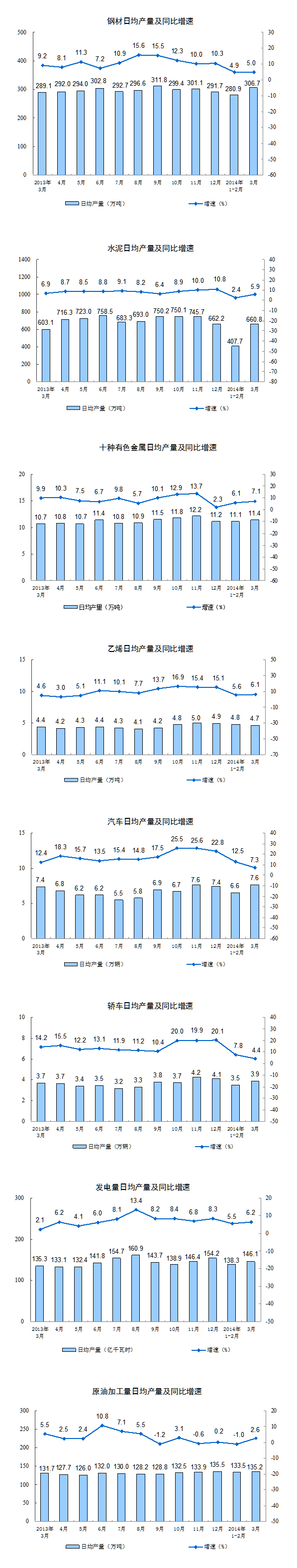 分產(chǎn)品看,3月份,多種產(chǎn)品同比增長(zhǎng)。其中,鋼材9507萬(wàn)噸,增長(zhǎng)5.0%;水泥20485萬(wàn)噸,增長(zhǎng)5.9%;十種有色金屬354萬(wàn)噸,增長(zhǎng)7.1%;乙烯145萬(wàn)噸,增長(zhǎng)6.1%;汽車(chē)236.3萬(wàn)輛,增長(zhǎng)7.3%;轎車(chē)120.7萬(wàn)輛,增長(zhǎng)4.4%;發(fā)電量4528億千瓦時(shí),增長(zhǎng)6.2%;原油加工量4192萬(wàn)噸,增長(zhǎng)2.6%。