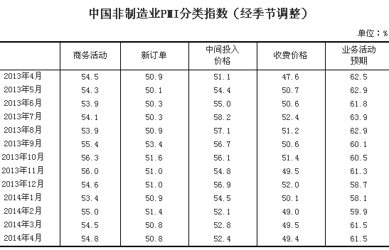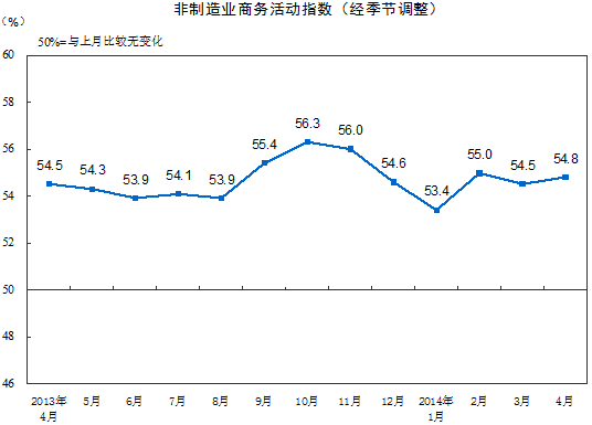 2014年4月,中國(guó)非制造業(yè)商務(wù)活動(dòng)指數(shù)為54.8%,比上月上升0.3個(gè)百分點(diǎn),高于榮枯線4.8個(gè)百分點(diǎn)。