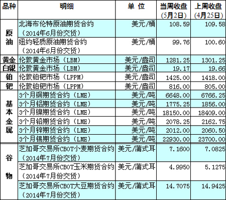 國際大宗商品期貨價(jià)格明細(xì)表[2014-5-5]