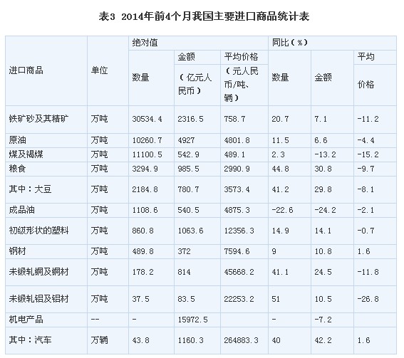 六、在進口商品中,主要大宗商品進口量增加,進口均價普遍下跌。前4個月,我國進口鐵礦砂3.05億噸,增加20.7%,進口均價為每噸758.7元,下跌11.2%;原油1.03億噸,增加11.5%,進口均價為每噸4801.8元,下跌4.4%;煤1.1億噸,增加2.3%,進口均價為每噸489.1元,下跌15.2%;糧食3294.9萬噸,增加44.8%;其中大豆2184.8萬噸,增加41.2%,進口均價為每噸3573.4元,下跌8.1%;成品油1108.6萬噸,減少22.6%,進口均價為每噸4875.3元,下跌2.1%;初級形狀的塑料860.8萬噸,增加14.9%,進口均價為每噸1.24萬元,下跌0.7%;鋼材489.8萬噸,增加9%,進口均價為每噸7594.6元,上漲1.6%;未鍛造銅及銅材178.2萬噸,增加41.1%,進口均價為每噸4.57萬元,下跌11.8%;未鍛造鋁及鋁材37.5萬噸,增加51%,進口均價為每噸2.23萬元,下跌26.8%。此外,機電產(chǎn)品進口1.6萬億元,下降7.2%;其中汽車43.8萬輛,增加40%(表3)。