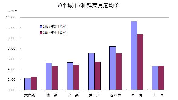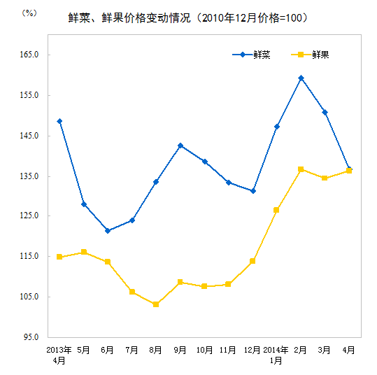 從發(fā)布的環(huán)比數(shù)據(jù)看,4月份鮮菜和豬肉價(jià)格下降比較突出,兩者合計(jì)影響CPI下降0.51個(gè)百分點(diǎn),超過(guò)了CPI總降幅,是環(huán)比下降的主要原因。從歷史數(shù)據(jù)看,鮮菜價(jià)格為近三年同期最低水平。國(guó)家統(tǒng)計(jì)局此前發(fā)布的50個(gè)城市主要食品價(jià)格監(jiān)測(cè)數(shù)據(jù)也顯示,今年4月份黃瓜、豆角、西紅柿和油菜每千克均價(jià)分別為5.42元、10.74元、7.07元和4.53元,比3月份均價(jià)分別下降了23.2%、18.7%、16.0%和14.1%,價(jià)格下降較多。