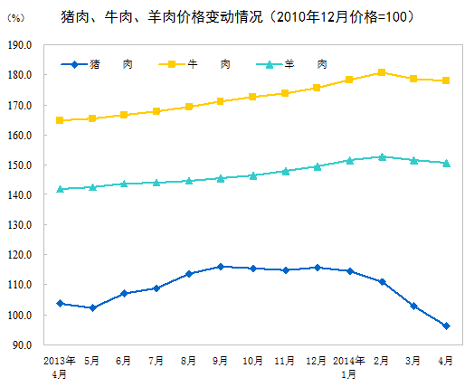摘要:2014年4月份,全國(guó)居民消費(fèi)價(jià)格總水平同比上漲1.8%,不及預(yù)期。統(tǒng)計(jì)局解讀指出,去年4月份受“倒春寒”天氣影響,鮮菜價(jià)格大幅上漲,而今年4月份全國(guó)平均氣溫較常年同期高1.1℃,鮮菜價(jià)格大幅下跌,兩相比較導(dǎo)致鮮菜價(jià)格同比下降7.9%,影響CPI同比下降0.28個(gè)百分點(diǎn)。另一方面,受供大于求的影響,豬肉價(jià)格連續(xù)4個(gè)月同比下降。