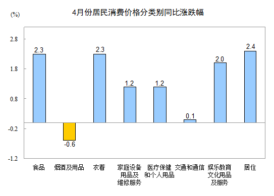 4月份,非食品價(jià)格環(huán)比上漲0.2%。其中,衣著、娛樂(lè)教育文化用品及服務(wù)、家庭設(shè)備用品及維修服務(wù)、居住價(jià)格分別上漲0.6%、0.3%、0.1%和0.1%;煙酒及用品、醫(yī)療保健和個(gè)人用品、交通和通信價(jià)格持平(漲跌幅度為0)。