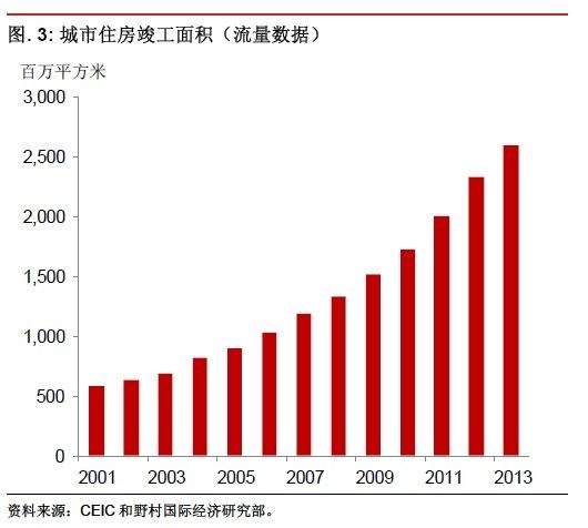 另一種說明這一問題的方式是看房地產(chǎn)市場供需的流量。在供應(yīng)方面,2014 年住房新竣工面積估計(jì)為23 億平方米,而在需求方面,預(yù)計(jì)城鎮(zhèn)人口增加1,870