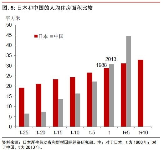 日本也是在其“經(jīng)濟(jì)奇跡”時(shí)期經(jīng)歷了住房面積的快速上升(圖5)。人均住房面積從1978年的24平方米上升至1988年的29平方米,隨后日本在1989年遭遇金融危機(jī),房地產(chǎn)泡沫破滅。今天的中國和20世紀(jì)80年代[最新消息價(jià)格戶型點(diǎn)評]末的日本有著相似之處,這應(yīng)該引起我們的警惕。我們估計(jì)中國人均住房面積也在2013年跨過日本1988的水平(約30平方米)。