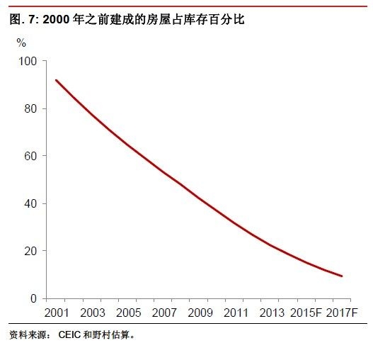 這種說法在2007 年之前是合理的,我們估計(jì)當(dāng)時(shí)2000 年之前建成的房屋占總房屋庫存的53.2%,但是該比例在2013