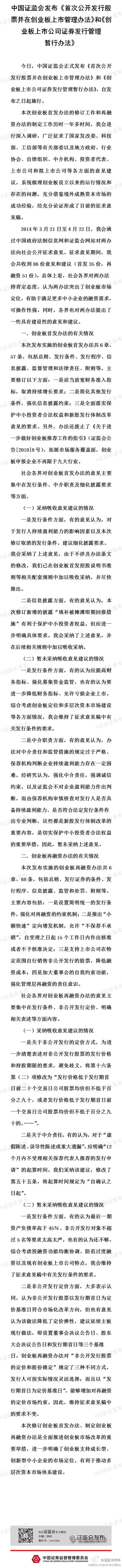 中國(guó)證監(jiān)會(huì)新聞發(fā)言人張曉軍今天介紹,創(chuàng)業(yè)板首發(fā)辦法的修訂和再融資辦法制定工作已經(jīng)結(jié)束,今天正式對(duì)外發(fā)布,兩個(gè)辦法自發(fā)布之日起實(shí)施。創(chuàng)業(yè)板再融資辦法中設(shè)置簡(jiǎn)明統(tǒng)一發(fā)行條件,推出小額定向發(fā)行機(jī)制,支持上市公司特定范圍自行銷售非公開發(fā)行股份,強(qiáng)化再融資責(zé)任意識(shí)。