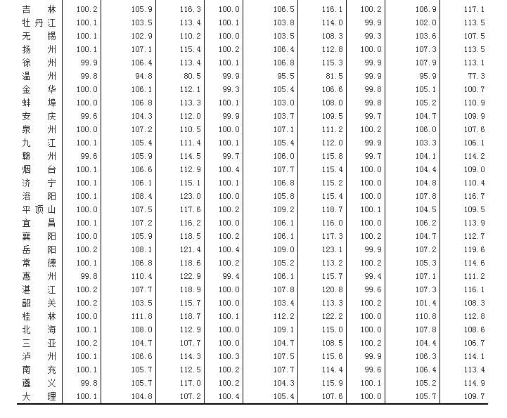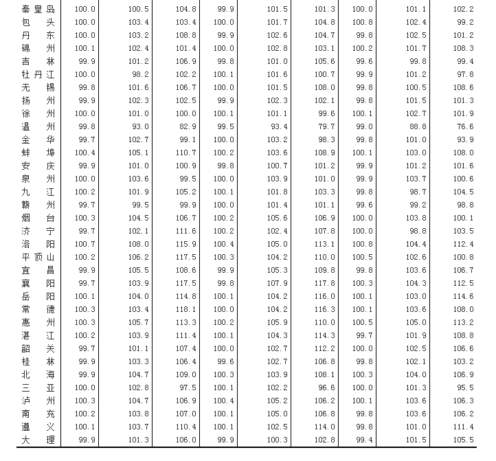 (一)與上月相比,70個大中城市中,價格下降的城市有8個,持平的城市有18個,上漲的城市有44個。環(huán)比價格變動中,最高漲幅為0.4%,最低為下降0.7%。