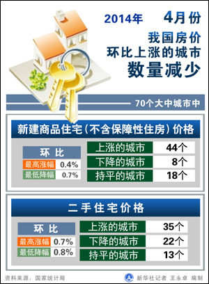 鏈家地產(chǎn)根據(jù)國(guó)家統(tǒng)計(jì)局?jǐn)?shù)據(jù)測(cè)算的價(jià)格指數(shù)顯示,2014年4月,70個(gè)大中城市平均新建商品住宅環(huán)比價(jià)格指數(shù)為100.06,較上月下降0.16點(diǎn),環(huán)比降幅達(dá)到近25個(gè)月最大,同比指數(shù)為106.76,較上月下調(diào)0.94點(diǎn);二手住宅價(jià)格平均環(huán)比指數(shù)為100.07,比上月下降0.05點(diǎn),同比指數(shù)為103.70,比上月下調(diào)0.46點(diǎn)。