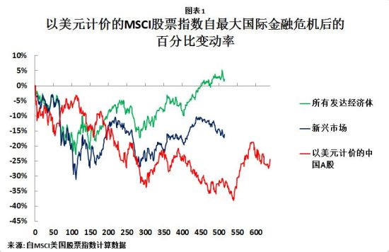 中國股市下跌的同期,發(fā)達(dá)經(jīng)濟(jì)體股市卻在上漲。整體來看,中國股市的表現(xiàn)比新興經(jīng)濟(jì)體低8.2個(gè)百分點(diǎn)。