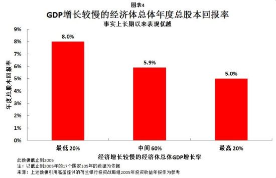 高盛私人財(cái)富管理部在仔細(xì)研究了這些數(shù)據(jù)后,就人均GDP增長和股價(jià)上漲之間的反比關(guān)系甚至跟不同經(jīng)濟(jì)體的增長率排名息息相關(guān)指出:“如果一個(gè)人在這一百年期間把資金投資在經(jīng)濟(jì)增長最慢的五個(gè)國家,其股市收益會(huì)比把資金投資在經(jīng)濟(jì)增長最快的五個(gè)國家平均每年高三個(gè)百分點(diǎn)……據(jù)我們自己對(duì)新興經(jīng)濟(jì)體1991年以來的分析顯示,新興經(jīng)濟(jì)體內(nèi)經(jīng)濟(jì)增長最慢的國家其股市收益比經(jīng)濟(jì)增長最快的國家要平均每年高五個(gè)百分點(diǎn)。”圖表4所示的是高盛對(duì)此關(guān)系的研究數(shù)據(jù)。