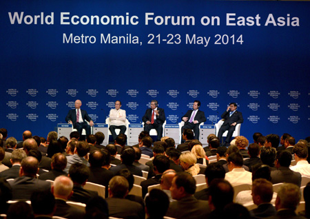 圖為世界經(jīng)濟論壇主席克勞斯·施瓦布、菲律賓總統(tǒng)阿基諾、印尼總統(tǒng)蘇西洛·班邦·尤多約諾、越南總理阮晉勇和緬甸副總統(tǒng)吳年吞參加22日的峰會(從左至右)。
