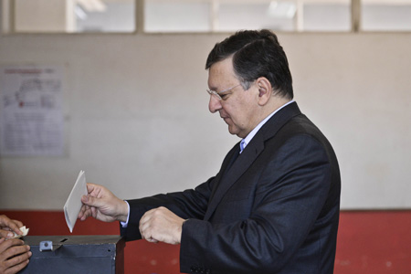 25日,歐盟委員會主席巴羅佐在里斯本一個投票站內投票。22日至25日,《里斯本條約》施行后首次歐洲議會選舉在歐盟28個成員國舉行,選舉結果將于全部成員國投票結束后,于布魯塞爾當?shù)貢r間25日深夜公布。