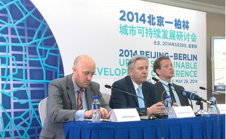 德國(guó)柏林市長(zhǎng)克勞斯·沃維萊特(中)29日在“2014北京-柏林 城市可持續(xù)發(fā)展研討會(huì)”上表示,歡迎更多中國(guó)企業(yè)到柏林投資。帶領(lǐng)柏林企業(yè)和高級(jí)經(jīng)濟(jì)代表團(tuán)來(lái)華訪問(wèn)的沃維萊特說(shuō),此次訪華將在經(jīng)濟(jì)和文化層面,展現(xiàn)出柏林作為向世界開(kāi)放的歐洲中心大都會(huì)的城市形象。德國(guó)工商大會(huì)、柏林工商大會(huì)主席艾瑞克·施威澤表示,此次訪華將加強(qiáng)雙邊經(jīng)貿(mào)活動(dòng),在中德企業(yè)決策者之間搭建互識(shí)和互信的橋梁。據(jù)悉,代表團(tuán)包括17家德國(guó)企業(yè),主要涉及交通、物流、能源和環(huán)境領(lǐng)域。