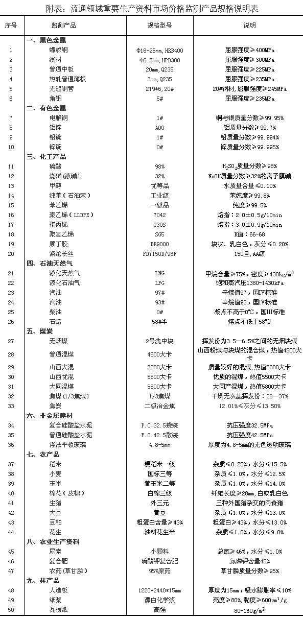 流通領(lǐng)域重要生產(chǎn)資料市場價(jià)格監(jiān)測內(nèi)容包括9大類50種產(chǎn)品的價(jià)格。類別與產(chǎn)品規(guī)格說明詳見附表。