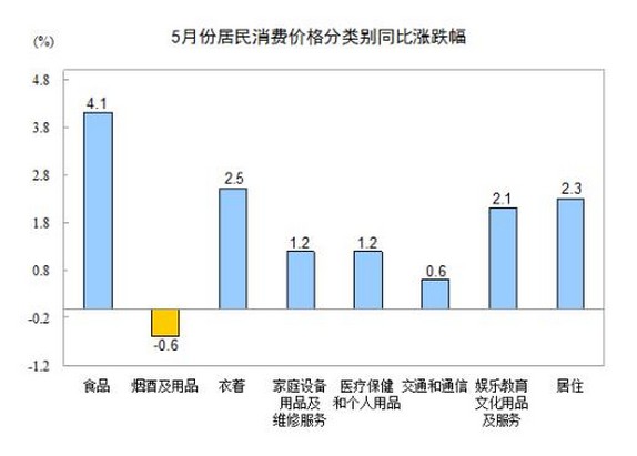 5月份,食品價格同比上漲4.1%,影響居民消費價格總水平上漲約1.35個百分點。其中,鮮果價格上漲20.0%,影響居民消費價格總水平上漲約0.43個百分點;水產(chǎn)品價格上漲5.0%,影響居民消費價格總水平上漲約0.13個百分點;肉禽及其制品價格上漲3.2%,影響居民消費價格總水平上漲約0.23個百分點(豬肉價格下降0.6%,影響居民消費價格總水平下降約0.02個百分點);糧食價格上漲3.0%,影響居民消費價格總水平上漲約0.09個百分點;鮮菜價格下降2.5%,影響居民消費價格總水平下降約0.08個百分點。
