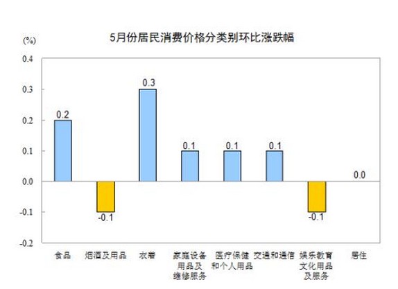 5月份,全國居民消費價格總水平環(huán)比上漲0.1%。其中,城市上漲0.1%,農(nóng)村上漲0.2%;食品價格上漲0.2%,非食品價格上漲0.1%;消費品價格上漲0.1%,服務價格持平(漲跌幅度為0,下同)。