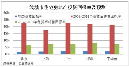 未來(lái)五年,一線城市房?jī)r(jià)理性回歸,或結(jié)束住宅投資黃金時(shí)代。從目前的情況來(lái)看,一方面,中國(guó)經(jīng)濟(jì)增長(zhǎng)正處于“切換”過(guò)程中,從原來(lái)10%左右的高速增長(zhǎng),下調(diào)到中高速或中速水平。宏觀經(jīng)濟(jì)增長(zhǎng)放緩,經(jīng)濟(jì)基本面難以支撐房?jī)r(jià)高位上漲。另一方面,北京、深圳等主要城市持續(xù)快速攀升的價(jià)格顯然已經(jīng)成為中央深化地產(chǎn)調(diào)控政策的重點(diǎn)。隨著2014年房地產(chǎn)信貸的加緊收縮、銀行加息,以及未來(lái)不動(dòng)產(chǎn)登記、房產(chǎn)稅征收問(wèn)題的解決,未來(lái)幾年里,一線城市房產(chǎn)市場(chǎng)將在市場(chǎng)規(guī)律主導(dǎo)下從超速增長(zhǎng)轉(zhuǎn)向平穩(wěn)增長(zhǎng)!2014年上半年中國(guó)房地產(chǎn)投資回報(bào)率研究》預(yù)測(cè)結(jié)果顯示,一線城市未來(lái)5年租賃后轉(zhuǎn)售回報(bào)率平均值為7.3%,與歷史5年租賃后轉(zhuǎn)售回報(bào)率平均值21.3%相比,降幅非常明顯,表現(xiàn)出明顯的去投資化趨勢(shì),一線城市住宅投資黃金時(shí)代正悄悄落幕。