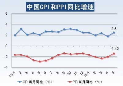 國家統(tǒng)計(jì)局?jǐn)?shù)據(jù)今日上午公布數(shù)據(jù)顯示,5月份,全國居民消費(fèi)價(jià)格總水平(CPI)同比上漲2.5%,創(chuàng)4個(gè)月新高,前值升1.8%,預(yù)期升2.4%;全國工業(yè)生產(chǎn)者出廠價(jià)格(PPI)同比降1.4%,環(huán)比降0.1%,前值降2.0%,預(yù)期降1.6%,連降27個(gè)月。以下為部分機(jī)構(gòu)和專家觀點(diǎn)匯總。