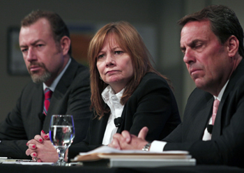 通用汽車首席執(zhí)行官芭拉(中)在公布關(guān)于因點(diǎn)火開關(guān)故障召回事件調(diào)查報(bào)告的發(fā)布會(huì)上!≠Y料照片 |