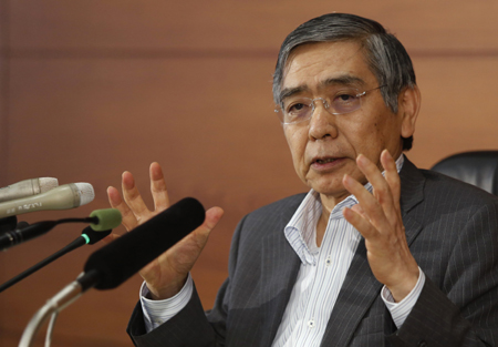 圖為日本央行行長(zhǎng)黑田東彥在新聞發(fā)布會(huì)上回答提問(wèn)。