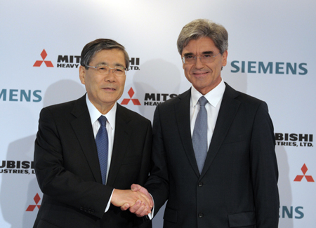 圖為德國西門子公司首席執(zhí)行官喬·凱澤(右)與三菱重工社長宮永俊一17日在法國巴黎的記者會上握手。
