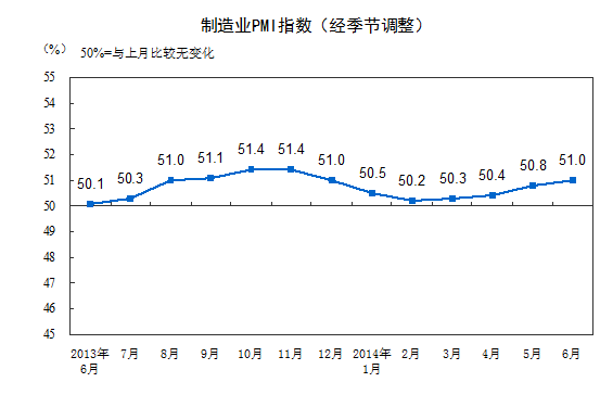 2014年7月1日國家統(tǒng)計(jì)局服務(wù)業(yè)調(diào)查中心和中國物流與采購聯(lián)合會(huì)發(fā)布的中國制造業(yè)采購經(jīng)理指數(shù)顯示,2014年6月中國制造業(yè)PMI為51.0%,比上月上升0.2個(gè)百分點(diǎn),連續(xù)4個(gè)月回升,表明我國制造業(yè)繼續(xù)保持平穩(wěn)向好的態(tài)勢。