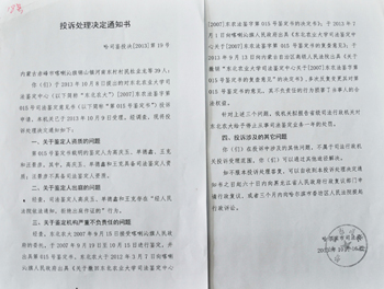 哈爾濱市司法局給果農(nóng)們下達(dá)的對(duì)東北農(nóng)業(yè)大學(xué)司法鑒定中心作出的投訴處理決定通知。