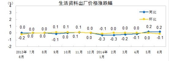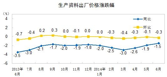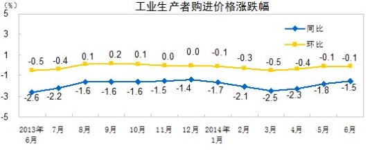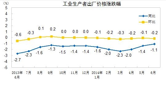 2014年6月份,全國工業(yè)生產(chǎn)者出廠價格同比下降1.1%,環(huán)比下降0.2%。工業(yè)生產(chǎn)者購進價格同比下降1.5%,環(huán)比下降0.1%。上半年,工業(yè)生產(chǎn)者出廠價格同比下降1.8%,工業(yè)生產(chǎn)者購進價格同比下降2.0%。