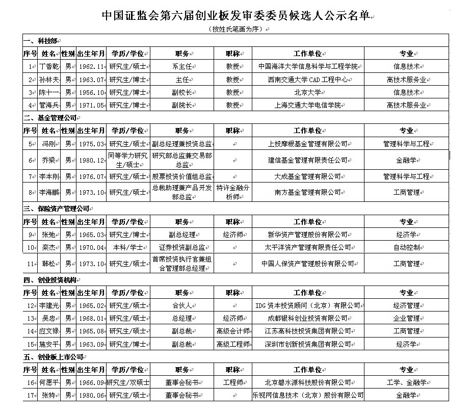根據(jù)《中國證券監(jiān)督管理委員會(huì)發(fā)行審核委員會(huì)辦法》(證監(jiān)會(huì)令第62號),第五屆創(chuàng)業(yè)板發(fā)審委將于近期屆滿。我會(huì)決定對委員進(jìn)行部分更換。各單位依程序向我會(huì)推薦了17名委員候選人,F(xiàn)將第六屆創(chuàng)業(yè)板發(fā)審委17名委員候選人名單予以公示(詳見附件)。