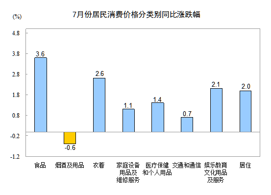 7月份,非食品價格環(huán)比上漲0.1%。其中,娛樂教育文化用品及服務(wù)、交通和通信、醫(yī)療保健和個人用品價格分別上漲0.8%、0.3%和0.1%;煙酒及用品、家庭設(shè)備用品及維修服務(wù)、居住價格均持平;衣著價格下降0.6%。