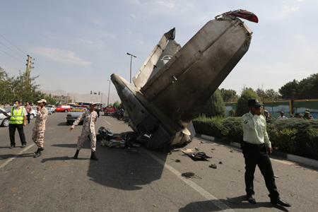 8月10日,在伊朗首都德黑蘭,伊朗革命衛(wèi)隊(duì)成員和安全人員聚集在飛機(jī)殘骸附近。