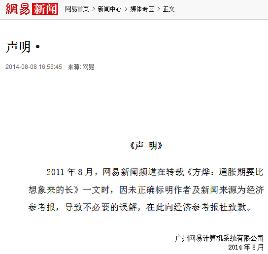 網(wǎng)易在致歉聲明中稱:“2011年8月,網(wǎng)易新聞頻道在轉(zhuǎn)載《方燁:通脹期要比想象來的長》一文時,因未正確標明作者及新聞來源為經(jīng)濟參考報,導(dǎo)致不必要的誤解,在此向經(jīng)濟參考報社致歉。”
