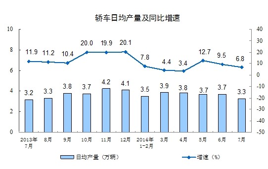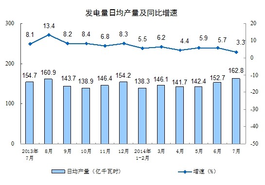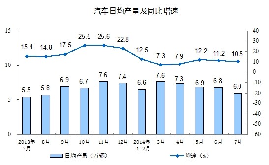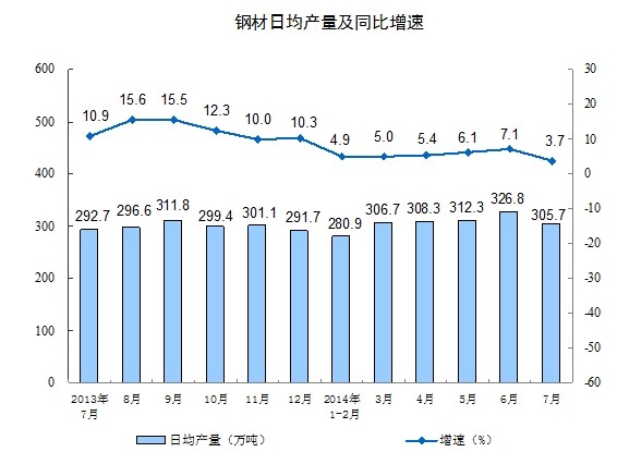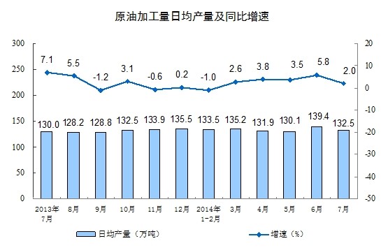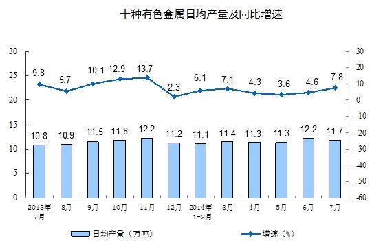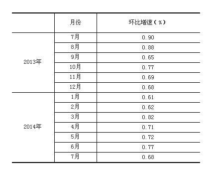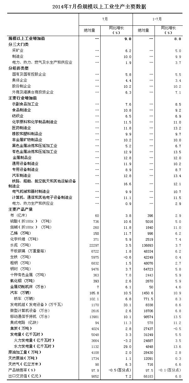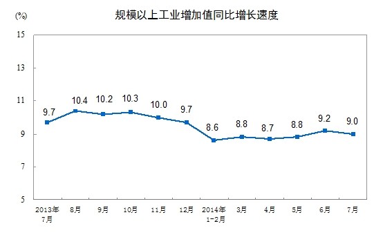 2014年7月份,規(guī)模以上工業(yè)增加值同比實(shí)際增長9.0%(以下增加值增速均為扣除價(jià)格因素的實(shí)際增長率),比6月份回落0.2個百分點(diǎn)。從環(huán)比看,7月份比上月增長0.68%。1-7月份,規(guī)模以上工業(yè)增加值同比增長8.8%。