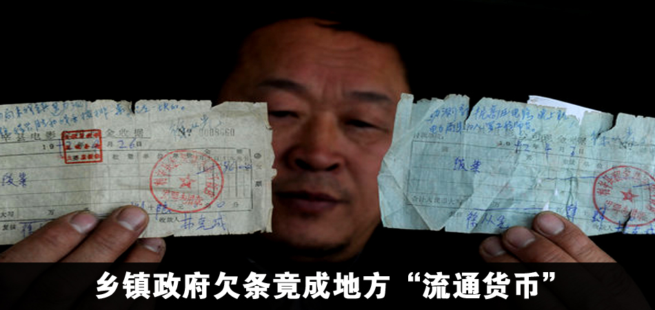 桃源縣農(nóng)村綜合改革領(lǐng)導(dǎo)小組辦公室主任郭學(xué)兵告訴記者,桃源縣39個(gè)鄉(xiāng)鎮(zhèn)全部負(fù)債,負(fù)債總額達(dá)8.1億元,鄉(xiāng)鎮(zhèn)平均負(fù)債2025.6萬(wàn)元。債權(quán)人多達(dá)21000多人次,絕大多數(shù)為當(dāng)?shù)馗刹咳罕姟?BR> 《經(jīng)濟(jì)參考報(bào)》記者在湖南一些負(fù)債嚴(yán)重的鄉(xiāng)鎮(zhèn)還了解到,相關(guān)地方“打折收購(gòu)”鄉(xiāng)鎮(zhèn)政府對(duì)個(gè)人欠條是門“生意”,一度欠條甚至還能折價(jià)買東西,成了地方“流通貨幣”。