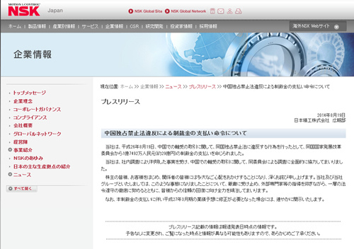 日本精工株式會社就因違反中國反壟斷法受罰發(fā)出的企業(yè)公告