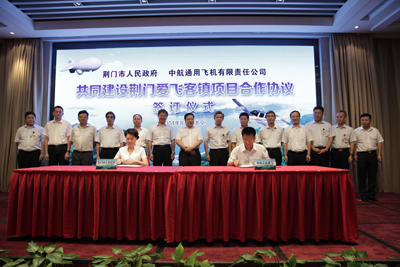 8月19日,全國首個通用航空綜合體項目——荊門愛飛客鎮(zhèn)合作建設在京舉行簽約儀式,中航工業(yè)通飛總經(jīng)理曲景文與荊門市市長肖菊華分別代表雙方在合作協(xié)議上簽字。湖北省副省長許克振、中國航空工業(yè)集團公司(以下簡稱中航工業(yè))總經(jīng)理譚瑞松、副總經(jīng)理徐占斌、吳獻東,荊門市市委書記萬勇等出席簽約儀式。