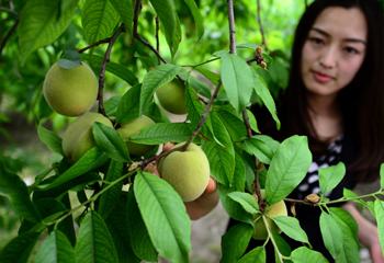 隴南市武都區(qū),一名科技人員正在查看“水果村”里的水果長(zhǎng)勢(shì) |