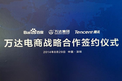 8月29日,萬達(dá)、騰訊和百度在深圳聯(lián)合召開發(fā)布會,正式宣布在香港注冊成立電子商務(wù)公司,一期總投資額高達(dá)50億人民幣,其中萬達(dá)持股70%,騰訊和百度各持股15%。