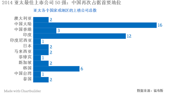 福布斯中文網(wǎng)29日公布了一年一度的福布斯亞太最佳上市公司50強(qiáng)榜單。和過(guò)去三年一樣,中國(guó)擁有最多的上榜公司。但由于中國(guó)目前正在經(jīng)歷經(jīng)濟(jì)增速放緩,因此上榜公司總數(shù)從前年的23家以及去年的20家下降至今年的16家。中國(guó)的房地產(chǎn)市場(chǎng)不景氣導(dǎo)致原本屬于上榜?偷姆康禺a(chǎn)開(kāi)發(fā)商今年均跌出榜單!