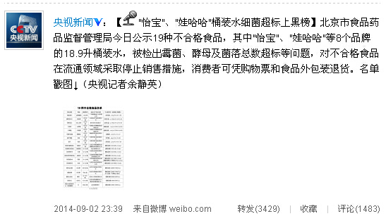 【"怡寶"、"娃哈哈"桶裝水細菌超標上黑榜】北京市食品藥品監(jiān)督管理局今日公示19種不合格食品,其中"怡寶"、"娃哈哈"等8個品牌的18.9升桶裝水,被檢出霉菌、酵母及菌落總數(shù)超標等問題,對不合格食品在流通領域采取停止銷售措施,消費者可憑購物票和食品外包裝退貨。(央視記者余靜英)