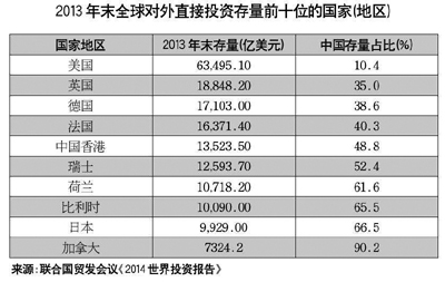 雖然我國對外投資增速迅猛,但從投資存量來看,與發(fā)達國家仍有較大差距。報告指出,2013年末,中國對外直接投資存量6604億美元,位列全球第11位,但其存量規(guī)模僅為同期美國的10.4%,英國的35%,德國的38.6%,法國的40.3%,日本的66.5%。