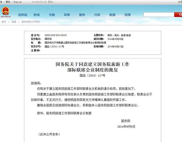9月15日晚,中國(guó)政府網(wǎng)公布《國(guó)務(wù)院關(guān)于同意建立國(guó)務(wù)院旅游工作部際聯(lián)席會(huì)議制度的批復(fù)》(下稱《批復(fù)》):“同意建立由國(guó)務(wù)院領(lǐng)導(dǎo)同志牽頭負(fù)責(zé)的國(guó)務(wù)院旅游工作部際聯(lián)席會(huì)議制度。聯(lián)席會(huì)議不刻制印章,不正式行文,請(qǐng)按照國(guó)務(wù)院有關(guān)文件精神認(rèn)真組織開(kāi)展工作。”