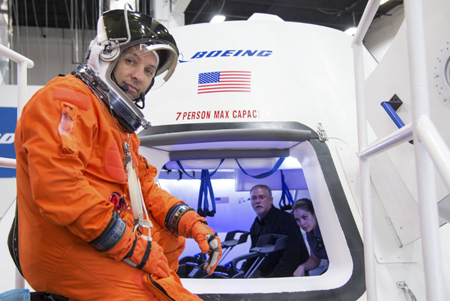 圖為在美國(guó)波音公司休斯敦產(chǎn)品支援中心,美國(guó)航天局宇航員蘭迪·布雷斯尼克準(zhǔn)備進(jìn)入CST-100航天器進(jìn)行測(cè)試(拍攝日期不詳)。