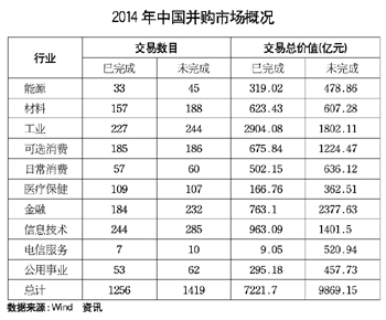 Wind統(tǒng)計(jì)數(shù)據(jù)則顯示,僅2014年以來,中國(guó)公司已經(jīng)完成的并購(gòu)交易數(shù)目就達(dá)到1256宗,交易總價(jià)值達(dá)到7222億元;未完成的并購(gòu)交易數(shù)目則達(dá)到1419宗,涉及金額更是高達(dá)9869億元,合計(jì)達(dá)到1.7萬億元之巨。相比之下,在重組相當(dāng)活躍的2013年,全年并購(gòu)交易也只有1296家次,金額合計(jì)6330億元。