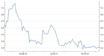 此次下調(diào)之后,正回購水平也再次創(chuàng)出3年半以來的新低。9月18日,14天期正回購中標(biāo)利率曾下調(diào)20個基點(diǎn),至3.5%。