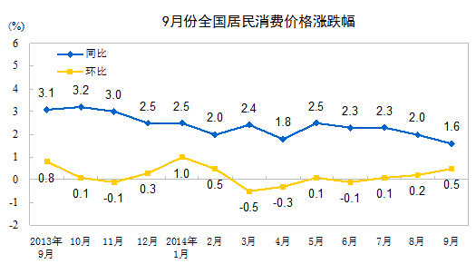 摘要:2014年9月份,全國(guó)居民消費(fèi)價(jià)格總水平同比上漲1.6%。全國(guó)居民消費(fèi)價(jià)格總水平環(huán)比上漲0.5%。