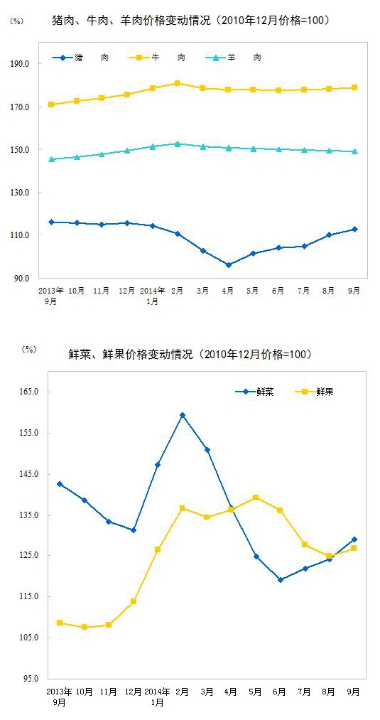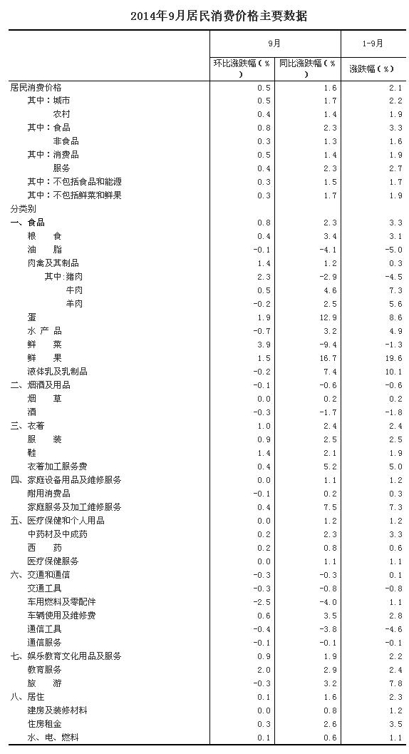 統(tǒng)計(jì)局15日發(fā)布數(shù)據(jù)顯示,2014年9月份,全國(guó)居民消費(fèi)價(jià)格總水平同比上漲1.6%。其中,城市上漲1.7%,農(nóng)村上漲1.4%;食品價(jià)格上漲2.3%,非食品價(jià)格上漲1.3%;消費(fèi)品價(jià)格上漲1.4%,服務(wù)價(jià)格上漲2.3%。1-9月平均,全國(guó)居民消費(fèi)價(jià)格總水平比去年同期上漲2.1%。