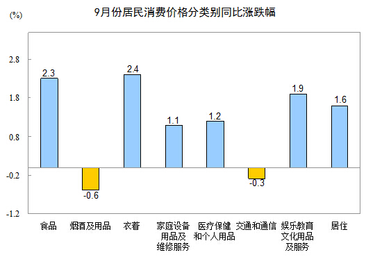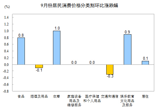 9月份,非食品價(jià)格環(huán)比上漲0.3%。其中,衣著、娛樂教育文化用品及服務(wù)、居住價(jià)格分別上漲1.0%、0.9%和0.1%;家庭設(shè)備用品及維修服務(wù)、醫(yī)療保健和個(gè)人用品價(jià)格持平(漲跌幅度為0);交通和通信、煙酒及用品價(jià)格分別下降0.3%和0.1%。